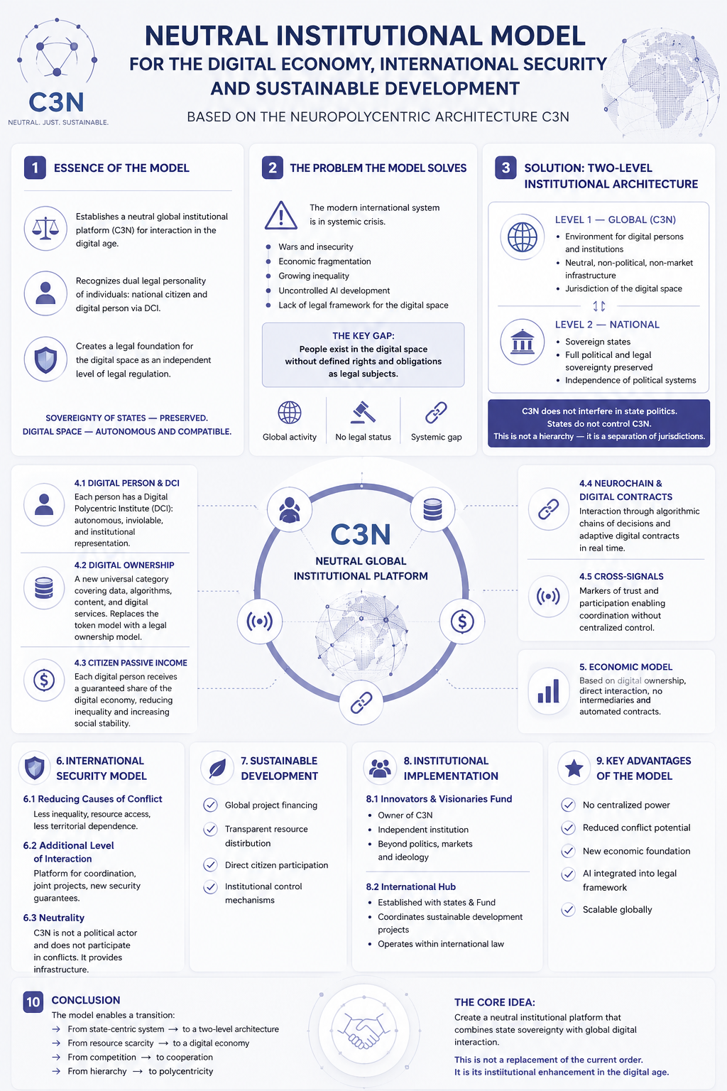 Модель пропонує створення нового рівня організації міжнародної взаємодії у цифрову епоху на основі  нейтральної глобальної інституційної платформи.